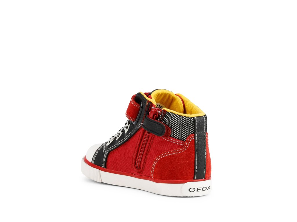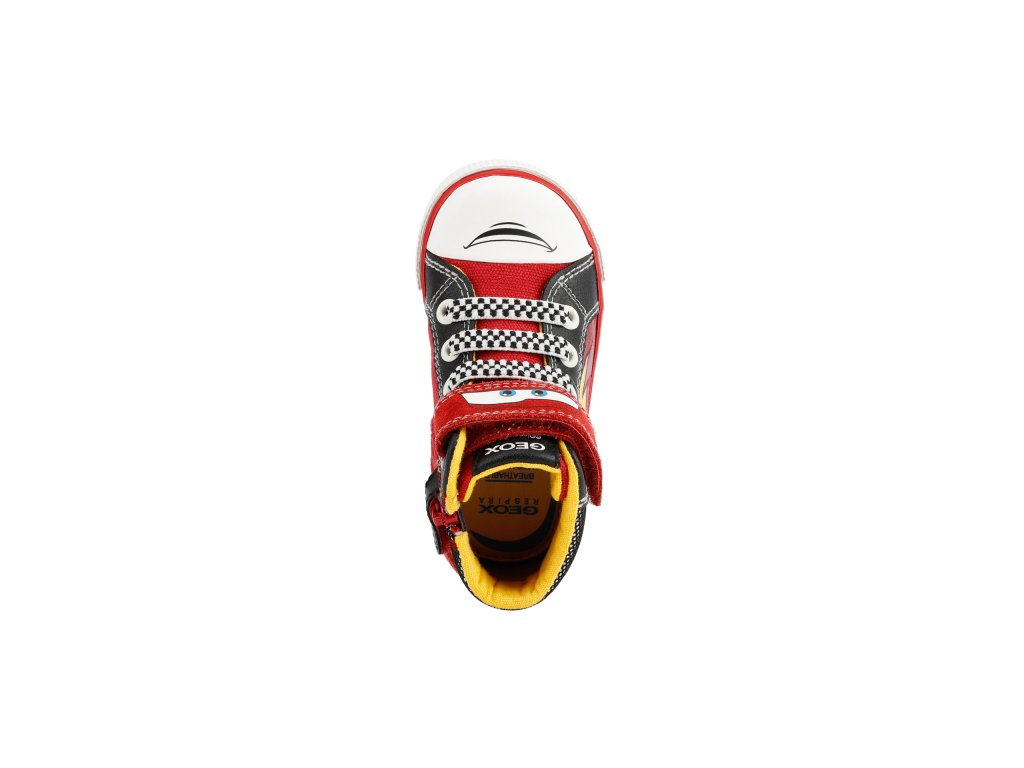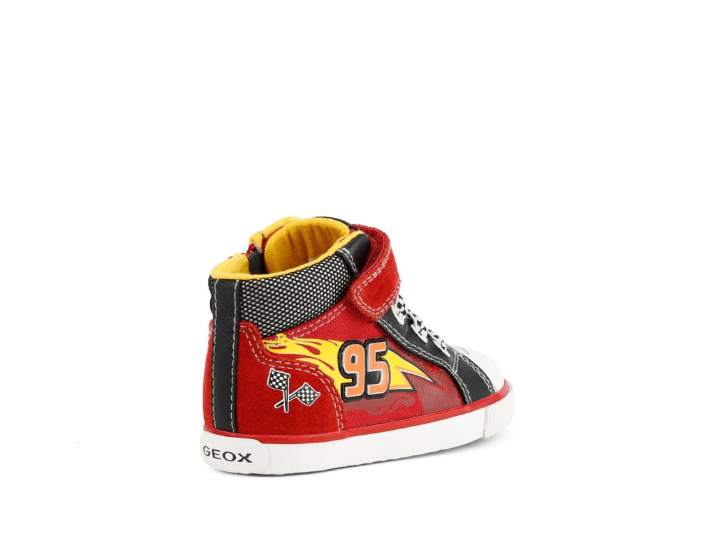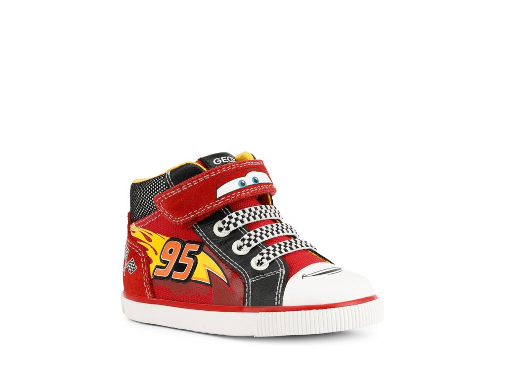 Tenisky Kilwi, produkt partnerství mezi Geox a Disney, jsou pro malé fanoušky Bleska McQueena a mají slavné číslo vytištěné na boku spolu s řadou detailů inspirovaných světem Cars. Veselé a hravé, ale také velmi pohodlné, jsou vyrobeny z plátna a semišové kůže v červené a černé barvě.